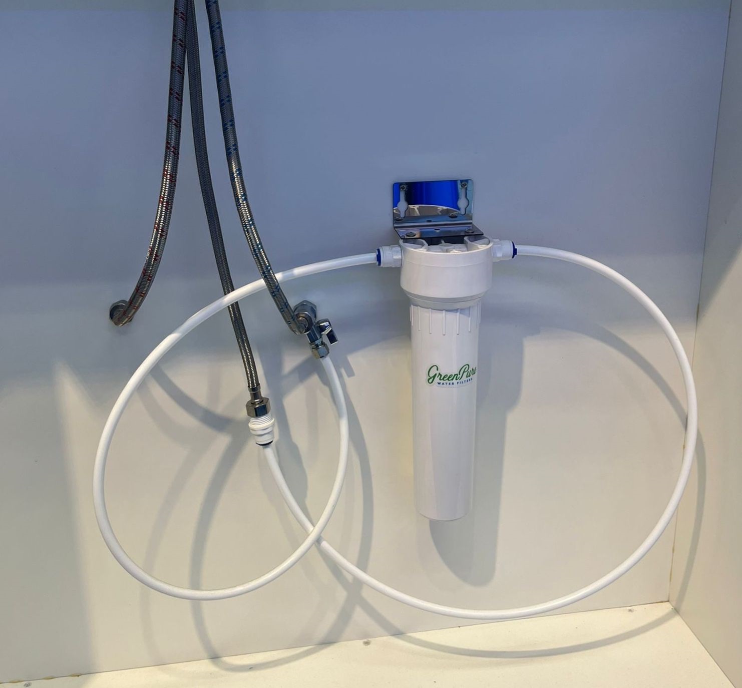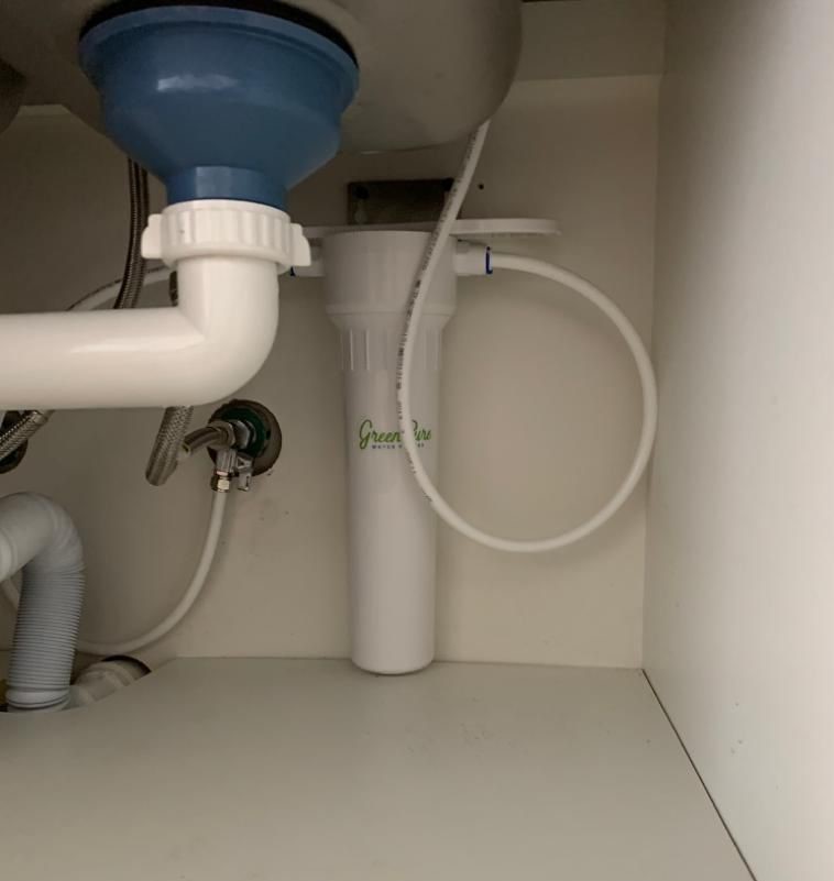 Este purificador bajo mesada es ideal para usar junto con una grifería de 3 vías o con grifo independiente. Ocupa muy poco espacio bajo la mesada y en su interior utiliza un filtro de cerámica y carbón activado de 4 etapas.